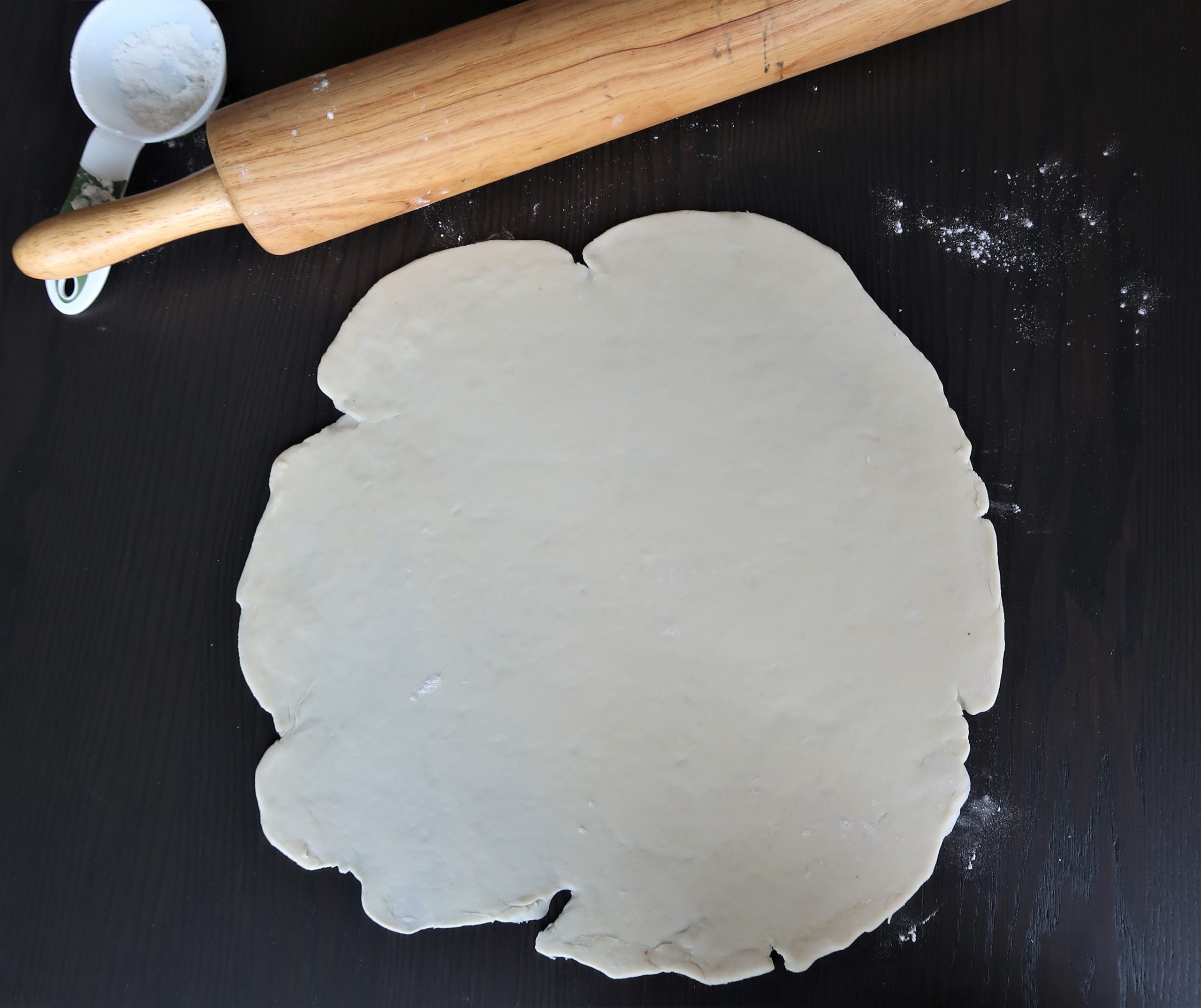 Using a sharp knife or a pizza cutter, cut the rough edges off to create a circle that is approx. 11 inches in diameter.
