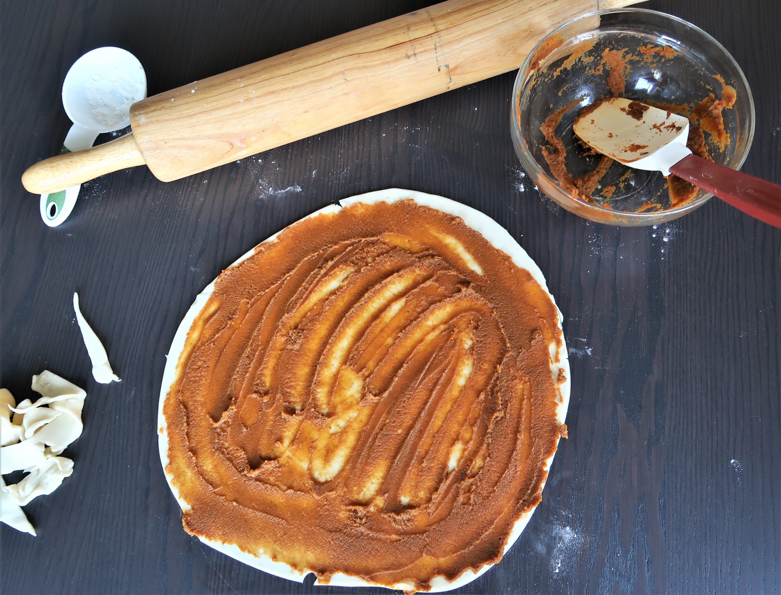 - Trim edges of the dough so that it roughly resembles a circle. Spread a thin layer of filling on the dough