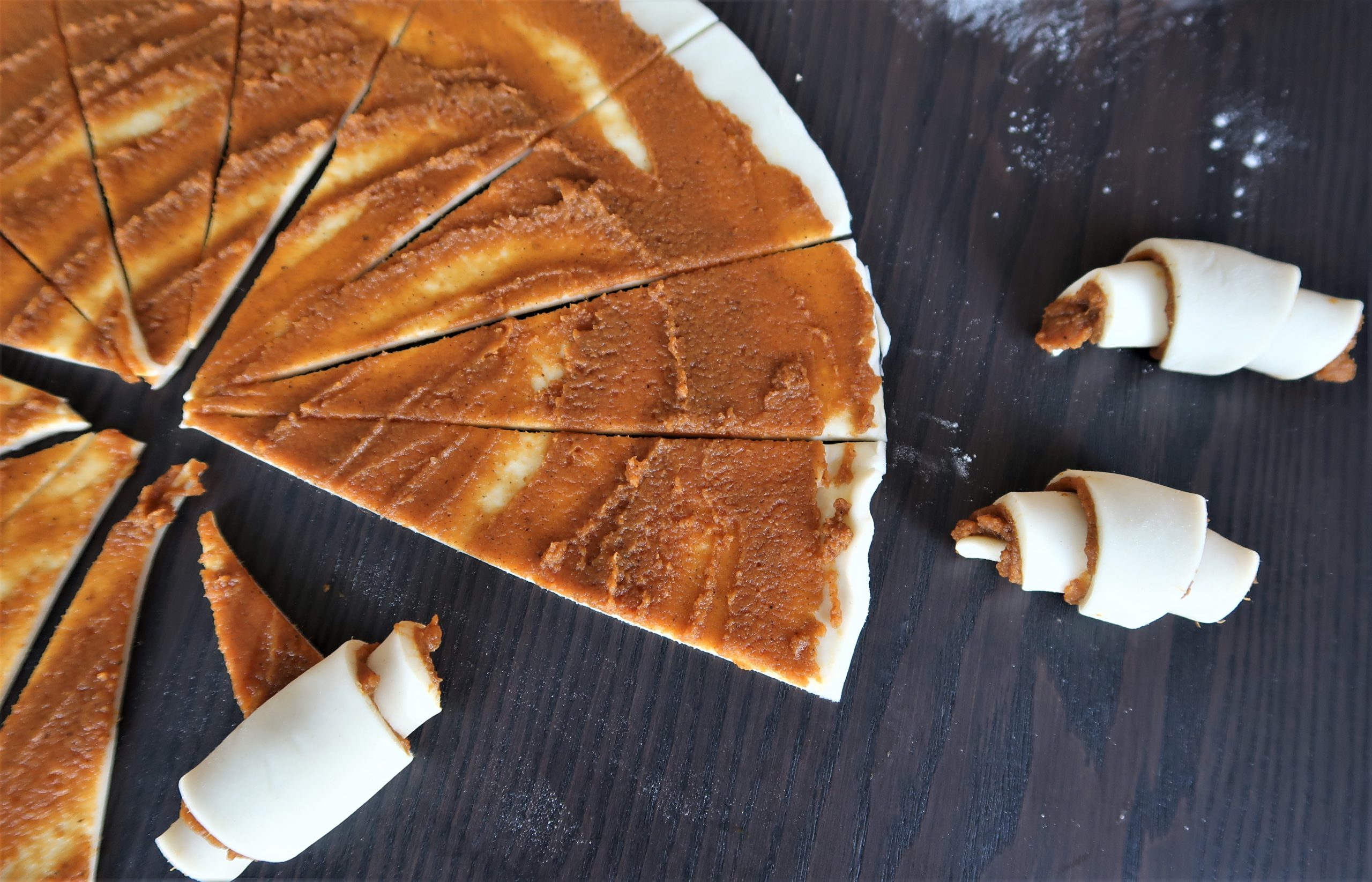 Spread a thin layer of filling on the dough and cut it into 16 triangular pieces.*