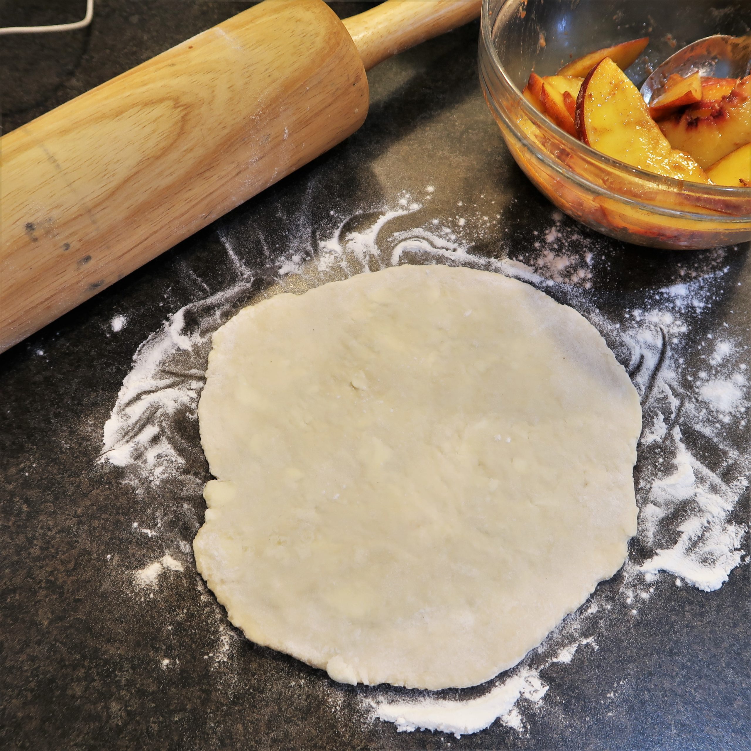To make filling slice 5 peaches in half and remove the pit. Cut peaches into thin slices and put into a medium bowl. Mix in flour, sugar and cinnamon. Set aside while you prepare the dough.